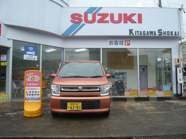 100円レンタカー、新車市場の看板が目印です。