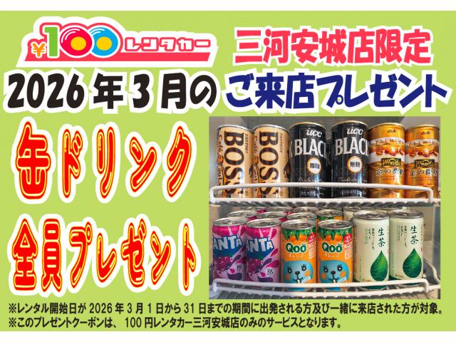 3月は毎回大好評をいただいております、出発前ドリンクプレゼントクーポンをやります!2026年3月1日(日)〜3月31日(火)の期間中、出発時にご来店されていた方全員にプレゼントとなりますので、ぜひクーポン欄もしくは画像を見せてゲットしてくださいませ☆「出発前にドリンクもらえるのありがたいです」などお喜びのお声を多数いただいております缶ドリンクプレゼントクーポン!ぜひドリンクを飲みながらドライブやおでかけをお楽しみくださいませ♪